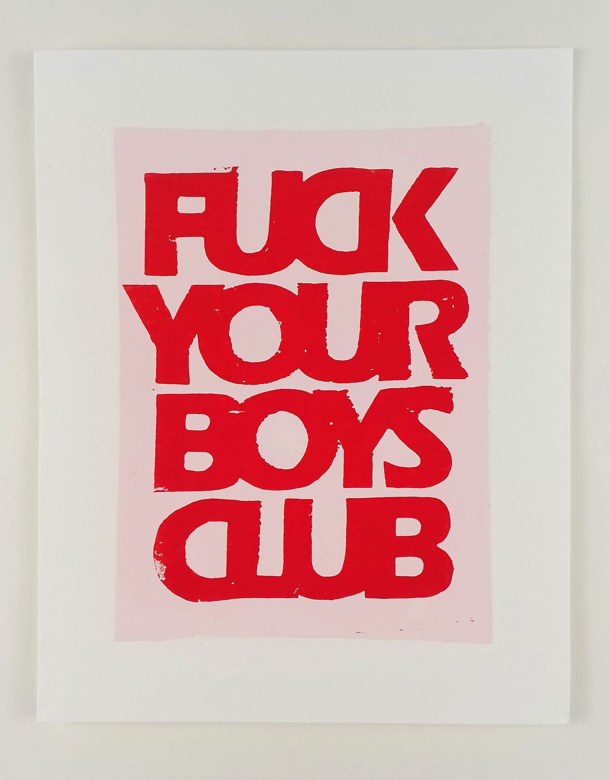 'Fuck Your Boys Club' 2025 - 8x10inch/20x25cm lino print on 200gsm acid free paper. Two layer, printed by hand. Red on Light Pink background. Limited edition of 25 - all signed, dated and numbered. NB. each print is unique, they are all hand printed, so variations will occur!