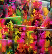 43 Paintings on cardboard CD sized envelopes, 43 paintings painted together, painted at the same time. Acrylic, spraypaint, brushwork, gloss varnish on cardboard, 13cm x 13cm , 2018.