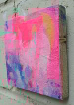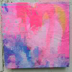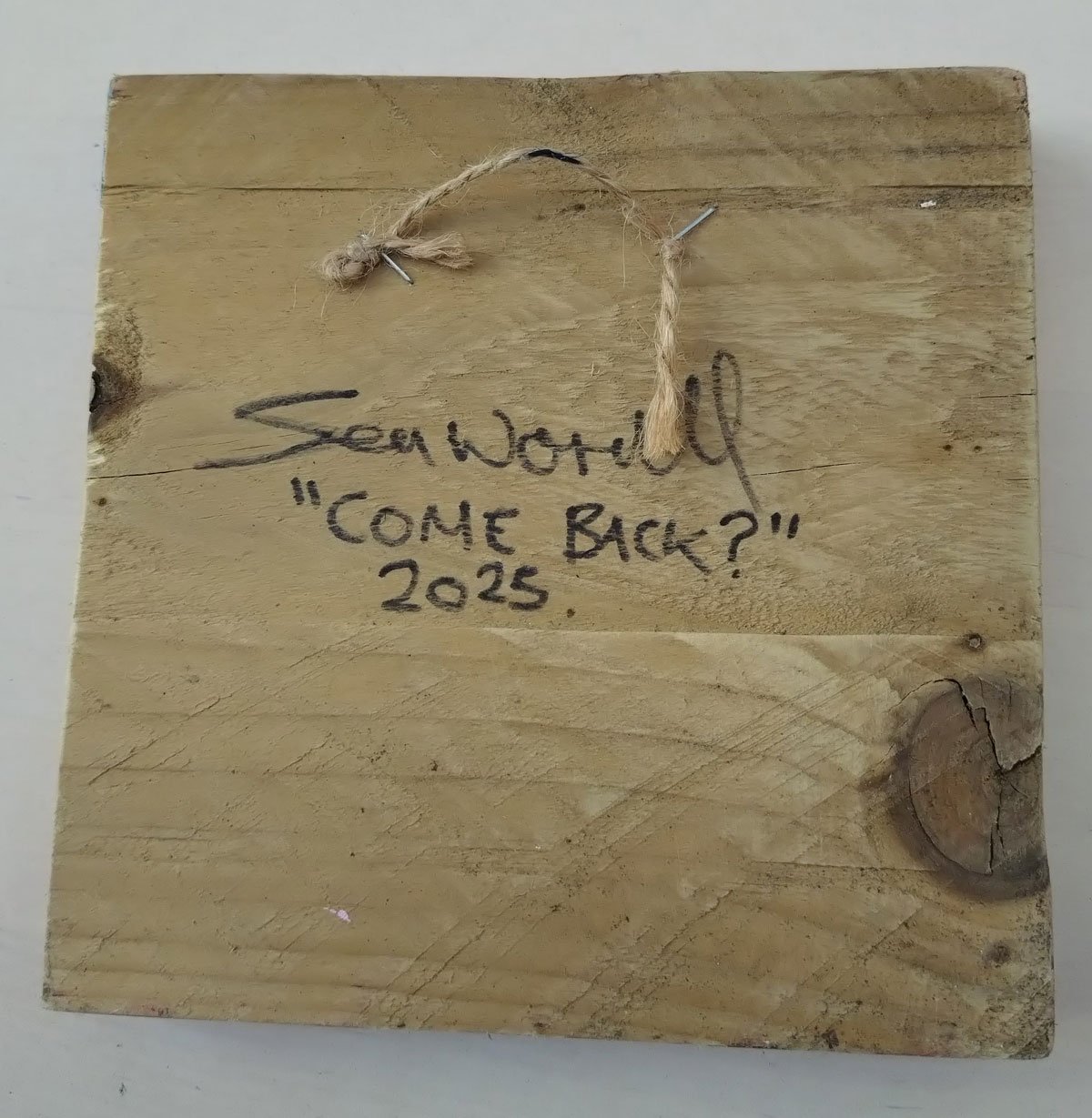 Come Back? (August 2025) Acrylic, gloss varnish on found wood, 14x14x2cm - A smaller painting concluded on a piece of wood found on the street, a piece of wood found, cleaned and put to good use (well I hope it is considered good use?)